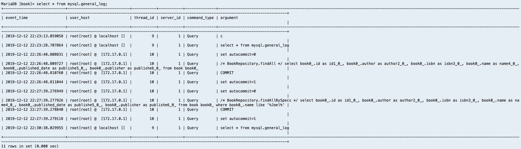 mysql 클라이언트에서 로그를 확인한다.