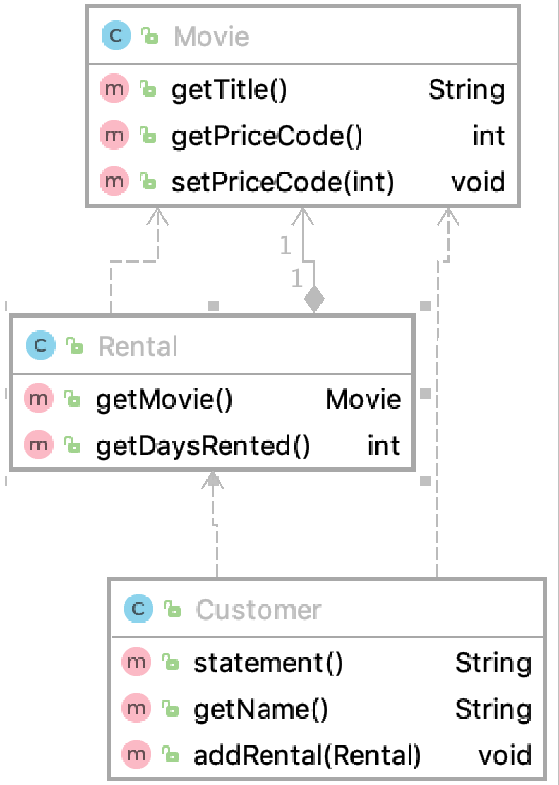 리팩토링을 하게 된 이유는 두 가지 수정 요청 때문이다. 첫번째는 영화의 대여료, 적립포인트를 HTML로 출력도록 기능을 추가하는 것이다. 즉 htmlStatement라는 메서드를 추가하는 것이다. 두번째는 대여료 정책의 수정이다. 확실하게 정해지지는 않았지만, 영화의 타입이 추가되거나 타입별로 가격 정책이 변경될 수 있음을 의미한다. 이 두가지 변경사항에 좀 더 효율적으로 대응하기 위해서 리팩토링을 시작한다.