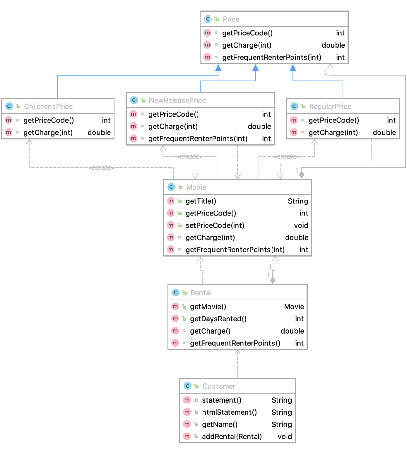 요구사항 분석을 통해서 영화의 타입에 따라서 가격이 변경될 가능성이 높다고 판단한다. 그래서 가격 계산하는 기능 곧 메서드를 Rental에서 Movie로 이동한다. Movie 클래스를 상속하여 NewReleaseMovie, RegularMovie, ChildrensMovie를 만들고 가격 계산하는 메서드를 재정의 할까 생각해보지만, 영화의 생명주기 상 언제든 영화 타입이 변경될 수 있기 때문에 그 방법은 하지 않기로 한다. (이런 상속 구조를 하게 되면 영화 타입을 변경할 때 마다 서버를 재시작해야 한다.) 그래서 디자인 패턴 중에 하나인 상태 패턴으로 Movie 클래스에 가격(Price)이라는 상태(필드)를 추가하기로 한다. 가격이라는 상태는 Price라는 추상 클래스와 그를 상속 및 구현한 NewReleasePrice, RegularPrice, ChildrensPrice로 표현한다. 그리고 Movie를 생성할 때 가격 코드를 통해서 알맞는 가격 상태가 설정되도록 구현한다. 가격 계산을 Price가 하도록 역할을 넘기고 대여료 계산하는 메서드를 각 Price 구현체에서 재정의하면 리팩토링은 끝이다. (적립금 계산동 동일하게 재정의 한다.)